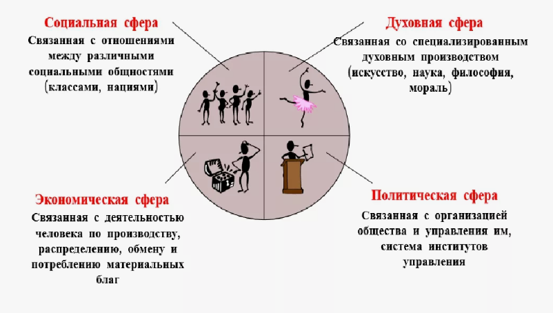 Человек реализуется в разных сферах жизни: в работе, в общении, в учёбе и т.д. Таким образом, можно выделить разные сферы деятельности. Расскажем про основные четыре, которые называют подсистемами или сферами жизни общества: