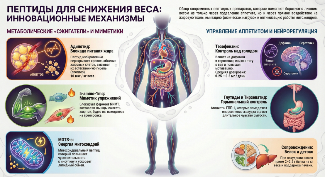 - Адипотид (Adipotide): Экспериментальный пептид, который вызывает апоптоз (гибель) жировых клеток, блокируя кровоснабжение жировой ткани. Требует осторожности из-за потенциального влияния на почки.