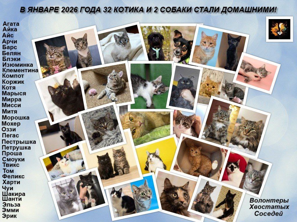 Добрый февральский вечер, наши неравнодушные! Поздравляю вас с последним месяцем зимы. А мы традиционно отчитываемся о проделанной работе. В январе 2026 года силами волонтёров группы "Хвостатые соседи" и при поддержке команды пиара 34 хвостика нашли свой дом и свою семью. 32 кота и 2 собаки будут жить свою лучшую жизнь в тепле, сытости, радости и валяясь на своих мягких лежанках. И мы снова вас благодарим. Благодарим всех и каждого в отдельности. За то, что вы с нами. За то, что мы на одной волне. За то, что у нас кураторов есть уверенность..ты не одна! У тебя есть крепкий тыл! Без вас мы бы не смогли все это...с Вами мы можем больше.