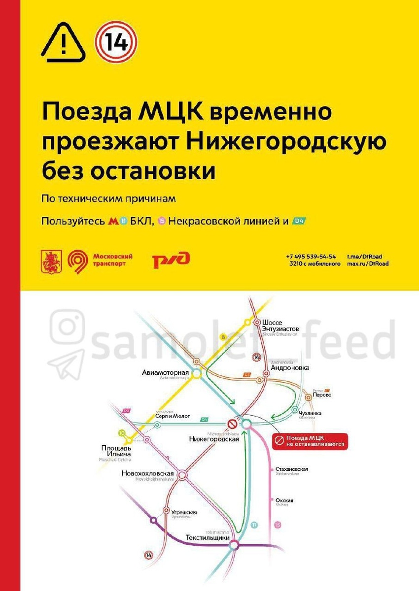 ». Сообщается, что платформу закроют на 6 месяцев. Вчера на станции МЦК «Нижегородская» было зафиксировано проседание части платформы с сохранением габарита пути. На месте создан межведомственный штаб и работает комиссия РЖД, разрабатываются восстановительные мероприятия с привлечением структурных подразделений ОАО «РЖД» - проектных институтов и строительных организаций. Для поездок пассажирам рекомендуется пользоваться станциями Большой кольцевой и Некрасовской линий метро, МЦД-4. Для проезда к Нижегородской подойдут и наземные маршруты: - От «Таганской» — автобусы е70, м7, т63, 51 и 766. - От «Рязанского проспекта» — автобусы е70 и т63. На станции и прилегающей территории дежурят сотрудники ЦОМП, которые при необходимости помогут выбрать оптимальный альтернативный маршрут следования. Также организовано информирование на станциях и в поездах метро, на МЦК и МЦД. О возобновлении остановки поездов на станции МЦК «Нижегородская» будет сообщено дополнительно. Движение на МЦК осущ