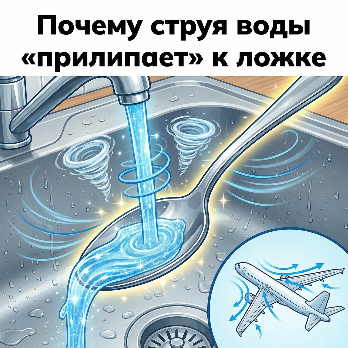 Попробуйте простой эксперимент: возьмите ложку и поднесите её выпуклой стороной к тонкой струе воды из крана. Струя не оттолкнётся, а наоборот — изогнётся и «прилипнет» к ложке, как будто её притягивает магнит. Это не магия и не статическое электричество. Это физический эффект, благодаря которому летают самолёты, работают кондиционеры и даже существуют летающие тарелки (настоящие, не из фантастики). В 1932 году румынский учёный Анри Коанда заметил странную вещь: струя воздуха или жидкости, вытекающая из узкого отверстия, не летит прямо, а стремится «прилипнуть» к ближайшей поверхности и течь вдоль неё. Этот феномен назвали эффектом Коанда. А в быту его часто называют «эффектом чайника» — именно из-за него, когда вы наливаете чай, струя иногда стекает по носику вниз, вместо того чтобы лететь в чашку. Когда струя воды или воздуха движется вдоль изогнутой поверхности, она увлекает за собой окружающий воздух. Между струёй и поверхностью образуется зона пониженного давления — своеобразный «