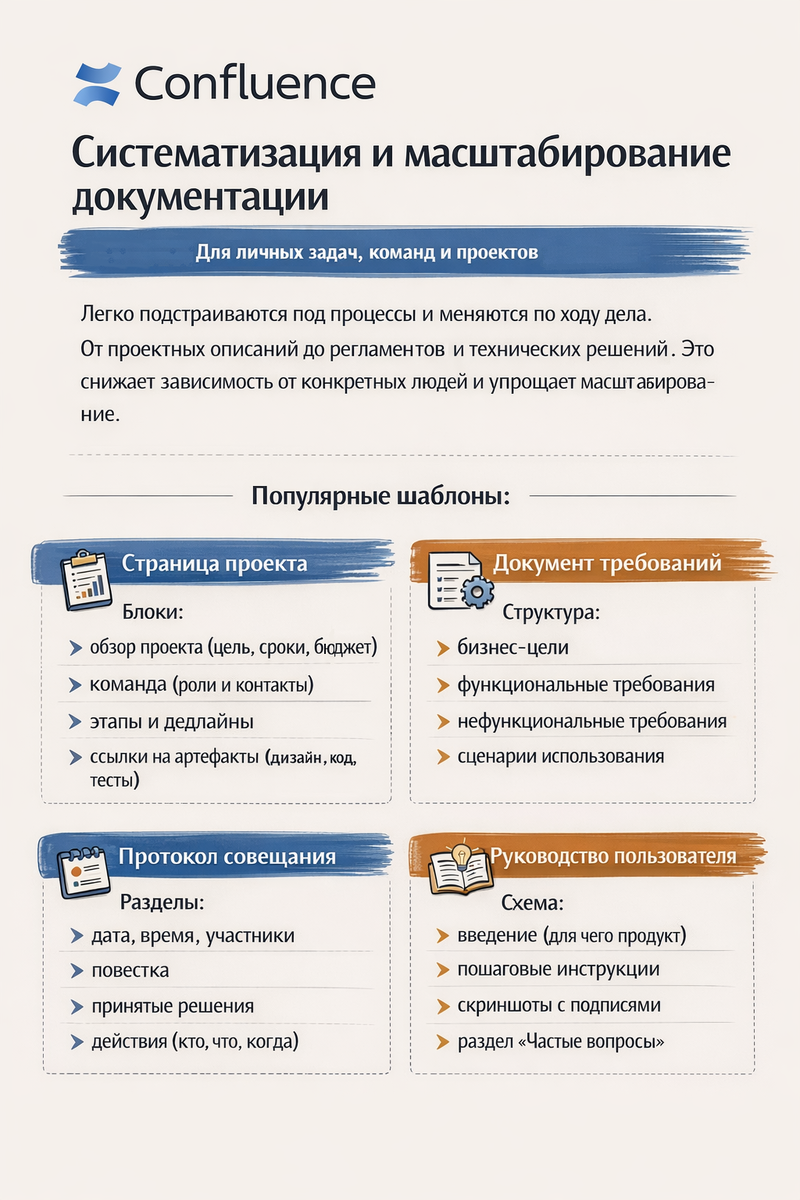 Схема: Шаблоны в Confluence - это управленческий инструмент. Они требуют осознанного внедрения и поддержки, иначе превращаются в формальность. Но при правильном использовании они стабилизируют процессы и делают работу команды предсказуемой. Попробуйте внедрить хотя бы 1-2 шаблона на следующей неделе - и оцените экономию времени!
