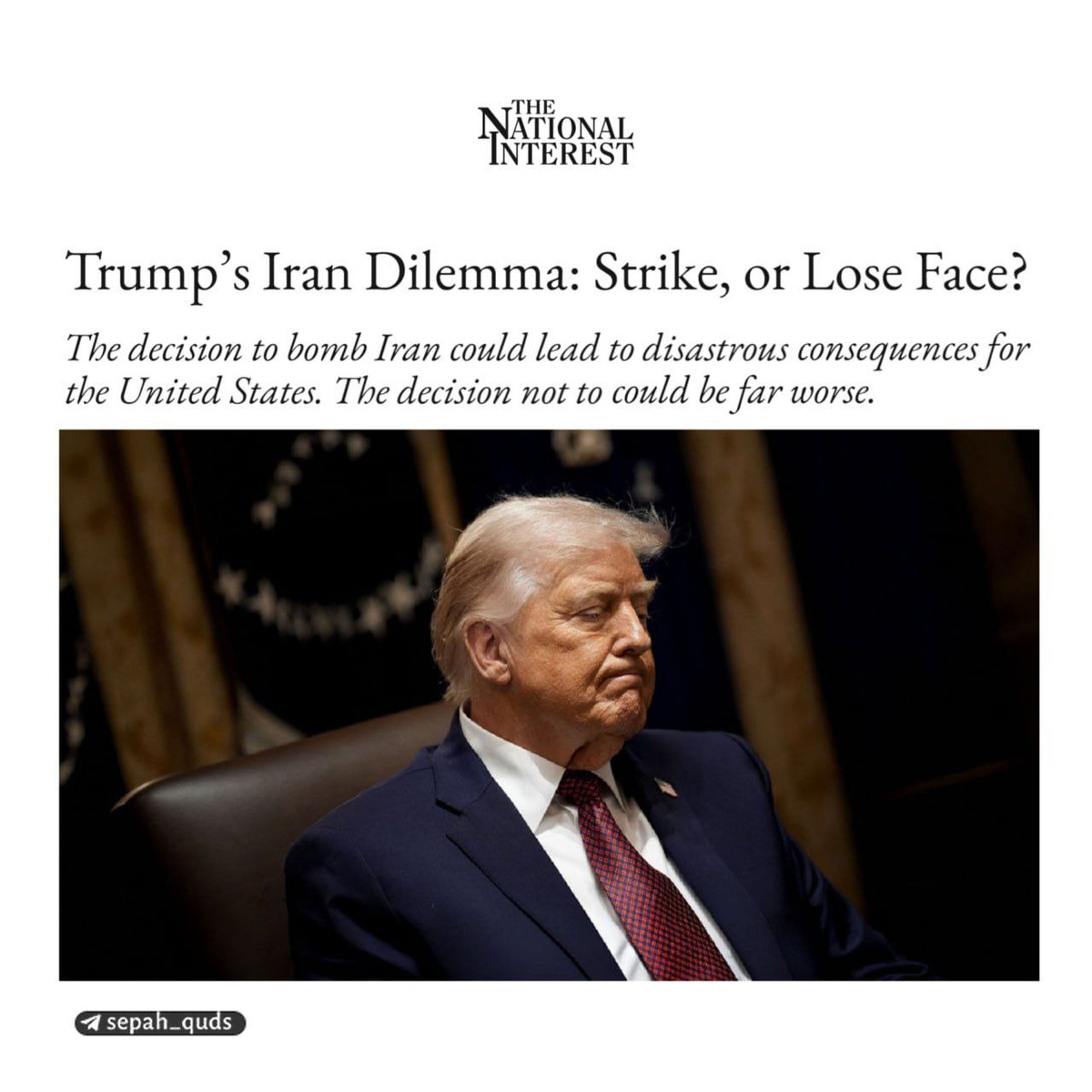 Террорист Трамп никак не может решить — атаковать Иран и столкнуться с катастрофическими последствиями, либо отступить от угроз и опозориться 💬 Американский журнал «National Interest» в своем анализе пишет: Если США начнут войну, они могут не суметь ее контролировать. Иран давно предупреждает, что любая атака США подожжет регион. Логика Ирана проста: расширение поля боя и рост затрат для США создадут политическое давление внутри Штатов. У Ирана много вариантов против американских сил в регионе: ракеты, беспилотники и атаки союзных группировок. Кроме того, в атаке на Иран есть «ловушка легитимности». Эта атака может привести к обвинениям оппозиции со стороны иранцев и уничтожить ее авторитет. С другой стороны, если атаки не будет, бездействие Трампа покажет его слабым, а США — обманщиками. Это подарок Исламской Республике, так как подтверждает оппозиции, что Штаты ненадежны, что совпадает с позицией правительства. 💬Trump is at a crossroads The terrorist Trump cannot decide in