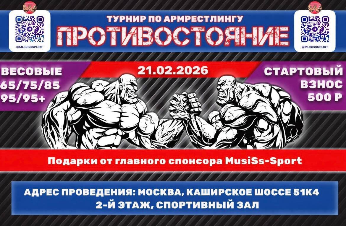 » ❗️21 февраля 2026❗️ 📍Адрес проведения: г. Москва, Каширское шоссе 51к4, 2-й этаж, спортивный зал 👉Категории: МУЖЧИНЫ: 65 / 75 / 85 / 95 / 95+ Регистрация и взвешивание: 9:30-11:00 Начало поединков в 11:30 Стартовый взнос: предварительная онлайн регистрация - 500 рублей, в день соревнований - 800 рублей ❗️Чтобы зарегистрироваться, пишем в телеграмм @samvel26_s Борьба проводится на правой руке до двух поражений💪 🥇Победители и призеры будут награждены фирменными грамотами и медалями. А самое важное, подарками от ГЛАВНОГО СПОНСОРА MusiSs-Sport🔥