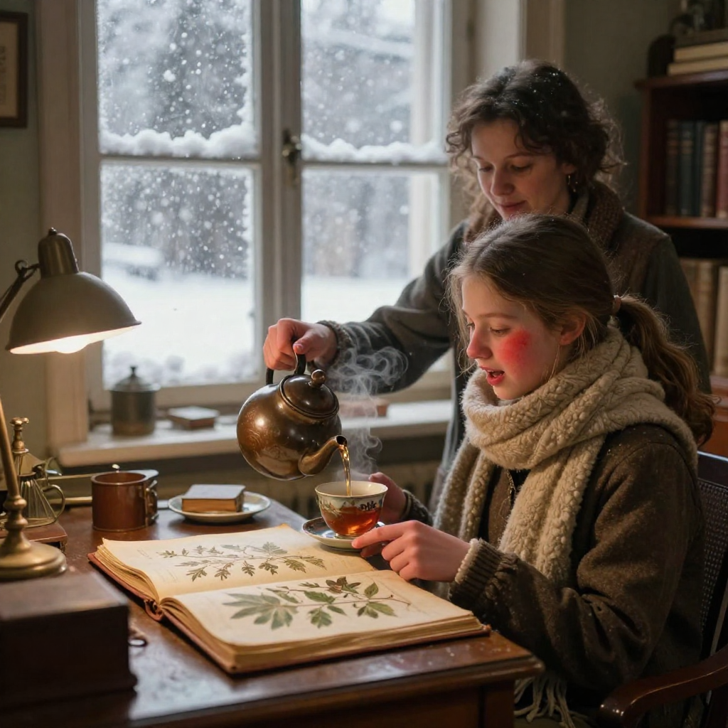 Девочку звали Ариша. Отогревшись, она начала с интересом разглядывать кабинет — книги, папки, старые фотографии на стене. А потом её взгляд упал на стеллаж, где в коробке лежали старые ботанические папки, приготовленные для ревизии.