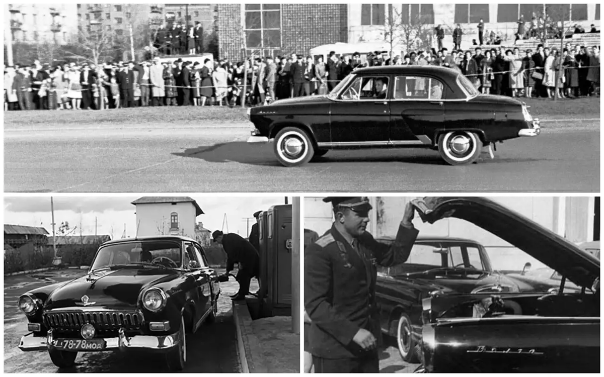 А вот на большинство кинохроник и фотографий попал другой автомобиль Юрия Алексеевича, тоже «Волга» с государственным номером 78-78 МОД. На фото ниже: