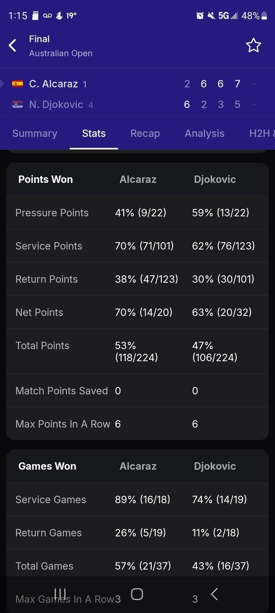 В 2026 году и Алькарас, и Синнер выиграли на 12 очков больше, чем Джокович в своих матчах против него.