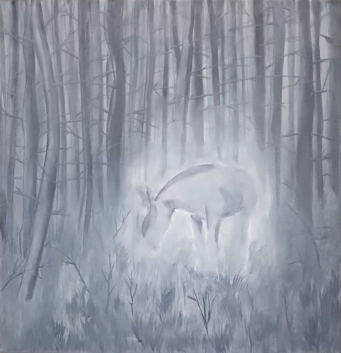 » В тяжёлые времена лошади много раз спасали людей 🐎 Они тянули грузы, шли на войну, терпели холод и страх. А когда становилось совсем пусто — их ели, чтобы кто-то другой выжил. Об этом редко говорят вслух. Но я об этом помню 🤍 Эта картина — про одну такую лошадь. Она погибла. Но её душа этого не заметила. Она всё так же тихо пасётся в лесу 🌫 щиплет траву 🌱 дышит туманом, живёт медленно и незаметно. Никому не мешает. Никого не тревожит. Мне хотелось показать не трагедию, а покой. Будто после всего пережитого ей наконец разрешили просто быть. Без пользы. Без долга. Без приказов. Монохром здесь не случайно. Цвет ушёл вместе с болью. Осталась тишина — мягкая, как выдох 🤍 Картина называется «Душа лошади». Для меня это работа про благодарность и про тихое продолжение жизни — даже тогда, когда кажется, что всё уже закончилось. А вам откликаются такие истории, рассказанные без слов? 🌲