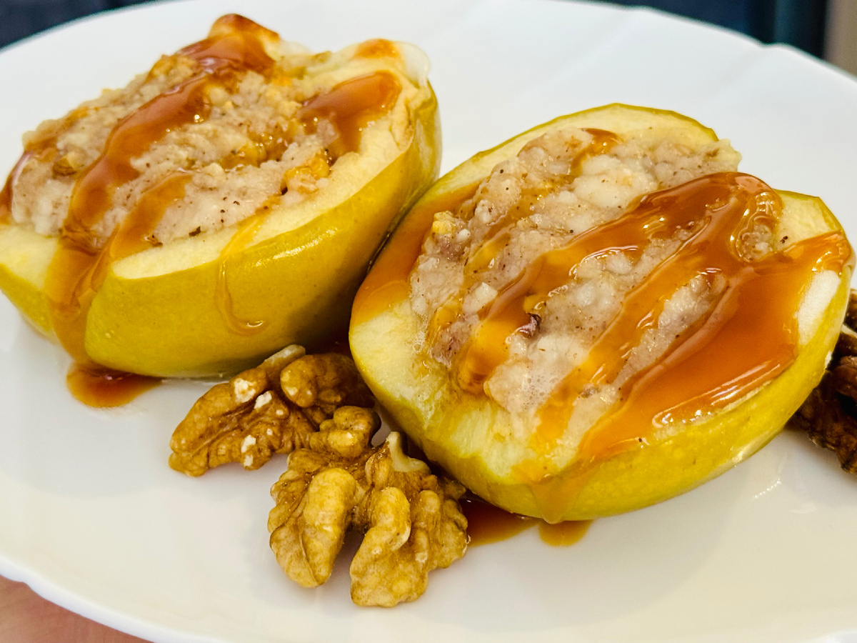 Печёные яблоки с творогом и мёдом в духовке — полезный десерт, который вписывается в принципы правильного питания (ПП). Сочетание запечённых яблок, творога и мёда содержит пектин — растворимые пищевые волокна, которые помогают регулировать работу кишечника.