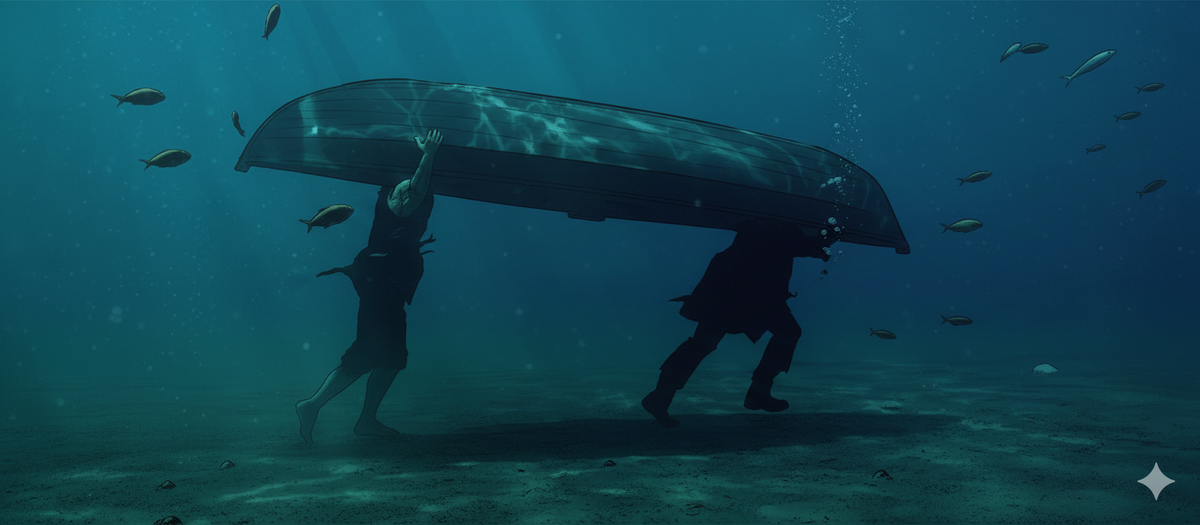 В какой-то из частей «Пиратов Карибского моря» капитан Джек Воробей и кто-то из его друзей, вероятно, Орландо Блум, придумали хитрый план, как пешком путешествовать по дну морскому, чтобы оставаться незамеченными. Они перевернули шлюпку, утянули её под своим весом на дно, оставив свои головы в образовавшемся воздушном кармане, пешком прокрались мимо кораблей других пиратов. Сегодня разберём, насколько реалистичен такой маневр. Для начала составим баланс: что позволяет лодке с пиратами оставаться на дне – вес самой лодки, пиратов, их одежды и снаряжения. Мешает им находиться на дне выталкивающая сила (она же сила Архимеда). Эта выталкивающая сила численно равна весу воды, вытесненной пиратами и шлюпкой. Теперь перейдём к расчётам или лучше даже воспользуемся оценками разрушителей мифов. Для шлюпки длиной 4 м, шириной 1,2 м и высотой бортов 0,5 м объём вытесненной воды составит около 1–1,5 м³. То есть такая перевернутая шлюпка будет хотеть всплыть с силой, эквивалентной 1–1,5 тоннам. Вер