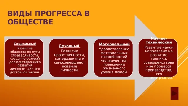 Прогресс (от лат. — продвижение, успех) — это такой тип развития, для которого характерен переход от низшего к высшему, от простого к более сложному, движение вперед к более совершенному. Особенности прогресса: Критерии прогресса: Регресс (от лат. — обратное движение) — это такой тип развития, для которого характерен переход от высшего к низшему, процессы деградации, понижения уровня организации, утраты способности к выполнению тех или иных функций. Стагнация (от лат. stagnum — стоячая вода) — задержка общественного развития. Прогресс может развиваться в двух наиболее характерных формах: 1) Реформа (от лат. — преобразовывать) — какое-то усовершенствование в общественной жизни, проводимое через ряд постепенных преобразований, не затрагивающих фундаментальные устои общества (традиции, обычаи, церковь, семью и пр.). 2) Революция (от лат. — поворот, возвращение к истокам) — коренное, качественное изменение всех или большинства сторон общественной жизни, затрагивающее основы существующ
