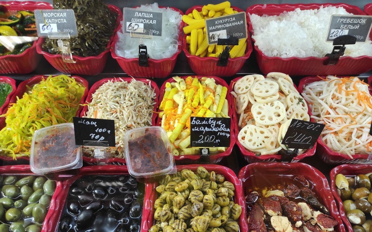 Выходя с рынка, залипли с подругой у прилавка с корейскими маринадами, я даже продуктов таких не видела в продаже, какие-то ростки, бамбук, лотосы, экзотические грибы!