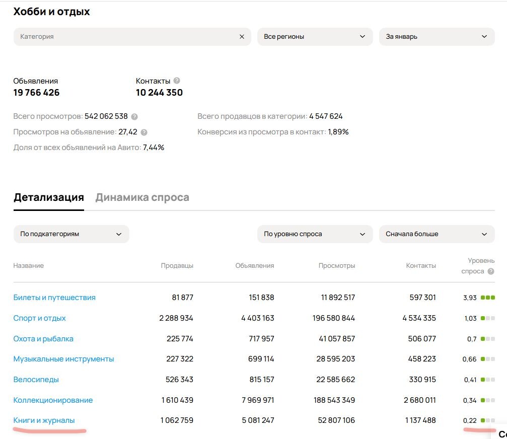Сейчас расстрою вас, ребят. Спрос почти как на детские вещи - очень маленький. Книги на Авито находится в категории Хобби и отдых (инфа для тех, кто еще только задумывается разобрать книжный шкаф) Отнюдь, не пытаюсь отговорить вас от этого вида расхламления. Инфа лишь для того, чтобы вы не ждать быстрой и выгодной продажи книг, а понимали ситуацию реально.