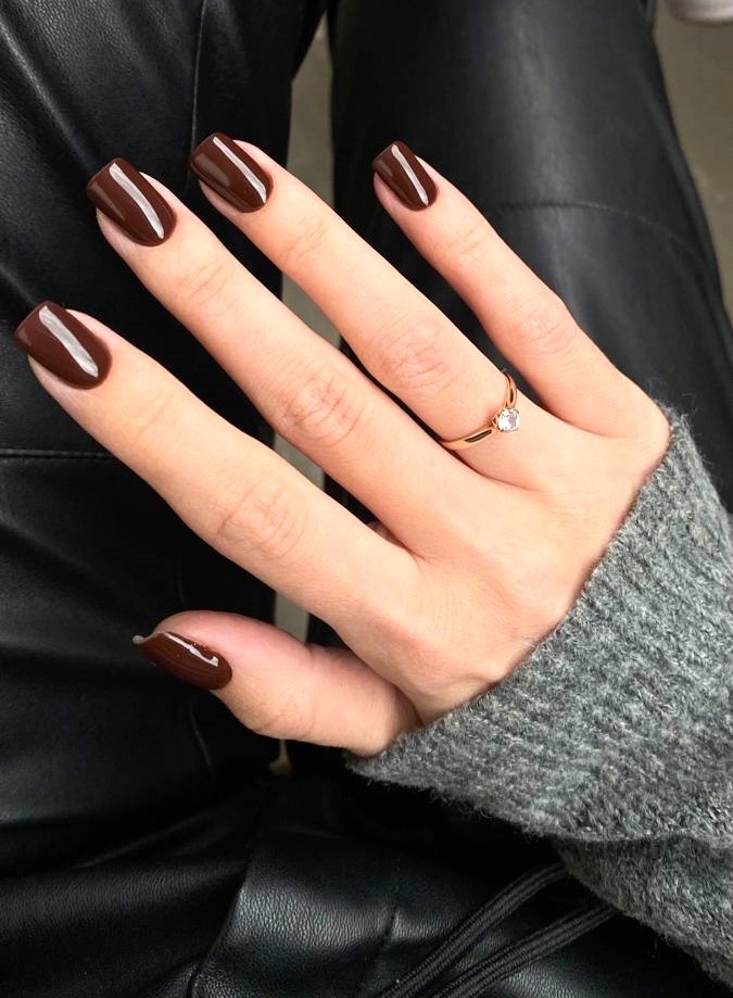 Маникюр в шоколадном цвете уже не первый сезон остается в трендах, и это не удивительно. Этот цвет универсален, в зависимости от выбора оттенка и декора уместен как для делового образа, так и для вечернего выхода, хорошо смотрится на ногтях любой длины и привлекательно выглядит и в минимализме, и со сложными украшениями. Шоколадный маникюр могут носить и молодые девушки, и зрелые дамы, и это тоже немаловажный фактор. 1. Однотонный маникюр. Минималистичное глянцевое покрытие в шоколадном цвете – это классический вариант маникюра. Строгий и сдержанный, он подходит для разных ситуаций. Шоколадный маникюр в разных оттенках можно выбрать и при офисном дресс-коде, и для прогулок с друзьями, и для похода в ресторан. 2. Шоколадный омбре. Нейл-арт, созданный плавными тонами переходов от карамели до мокко, вписывается в разные образы и стили. Он выглядит тепло, нежно, и отлично смотрится на ногтях разной длины. Интересным визуальным решением станет выполнение шоколадного градиента с вертикальны