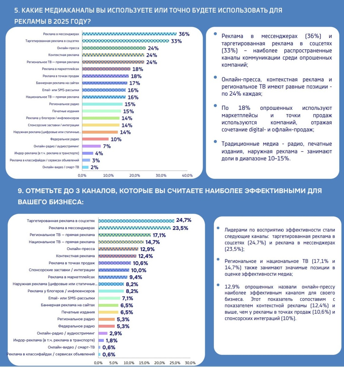 рекламных каналов: исследование медиамикса рекламодателей 2025" (Аналитический Центр Российской Индустрии Рекламы (АЦ РИР) Октябрь 2025 Москва). Планы использования в ближайшем будущем: • Региональное радио – 15%. • Федеральное радио – 10%. • Онлайн-радио / аудиостриминг - 7% Онлайн-радио и аудиостриминг зачем-то определили в один раздел, хотя поток интернет-вещания, где есть прямая реклама - это одна модель, а алгоритмический плейлист стриминга, где в бесплатной версии (без подписки) бывает реклама - другая модель. Поэтому этот пункт "аудиостриминг" не считается. Причины отказа от рекламы на радио: Считаем неэффективным для нашей отрасли / бизнеса === Федеральное радио 37% / Региональное радио 40% / Онлайн-радио 41% Слишком высокая стоимость размещения === Федеральное радио 29% / Региональное радио 18% / Онлайн-радио 18% Ресурсы компании не позволяют использовать === Федеральное радио 20% / Региональное радио 23% / Онлайн-радио 17% Не хватает знаний, опыта или подходящих специали