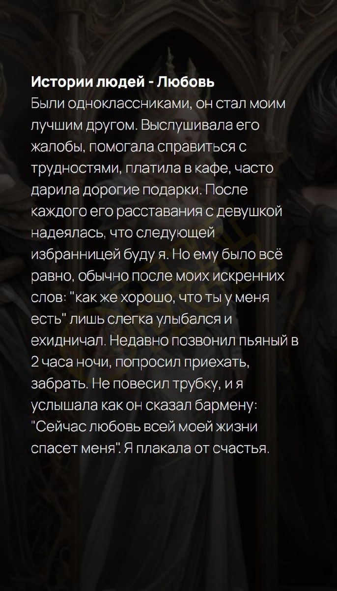 Истории людей - Любовь Были одноклассниками, он стал моим лучшим другом. Выслушивала его жалобы, помогала справиться с трудностями, платила в кафе, часто дарила дорогие подарки. После каждого его расставания с девушкой надеялась, что следующей избранницей буду я. Но ему было всё равно, обычно после моих искренних слов: "как же хорошо, что ты у меня есть" лишь слегка улыбался и ехидничал. Недавно позвонил пьяный в 2 часа ночи, попросил приехать, забрать. Не повесил трубку, и я услышала как он сказал бармену: "Сейчас любовь всей моей жизни спасет меня". Я плакала от счастья. Твой Ангел/Демон | расшифруйте свой уникальный код | Натальная карта T | VK | Pin | YouTub | Dzen #людимира#бабушкиидедушки#архивдобра#помогидругому#близкие#жизненныйурок#сердечность#помогай#ценности #1число #1февраля
