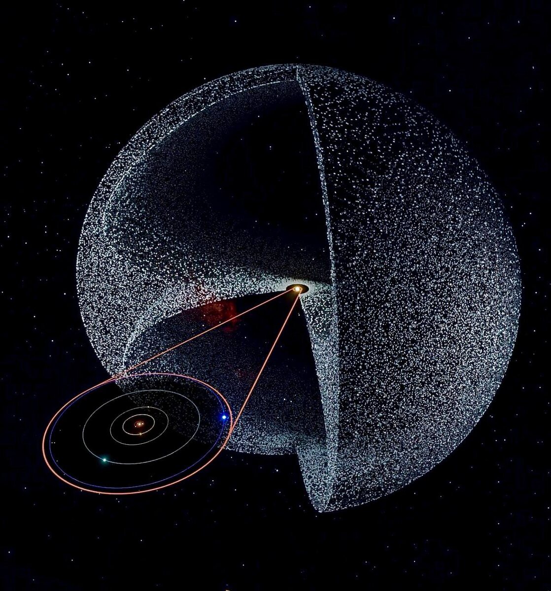Мы привыкли к её «плоской» планетарной части. Однако за орбитой Нептуна начинаются обширные сферические области: • Пояс Койпера — дископодобное кольцо ледяных тел и карликовых планет. • Облако Оорта — гигантская сферическая оболочка из триллионов ледяных объектов (в основном это ядра комет). Именно оно придаёт системе шарообразную форму. Его внешняя граница удалена на расстояние около 1 светового года от центра Солнечной системы — это в 100 000 раз дальше, чем Земля от Солнца. Спокойной ночи, земляне! «Щукин и всё»