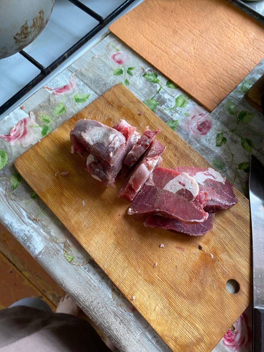 - Нарезаем подмороженную говядину— так она режется аккуратнее.