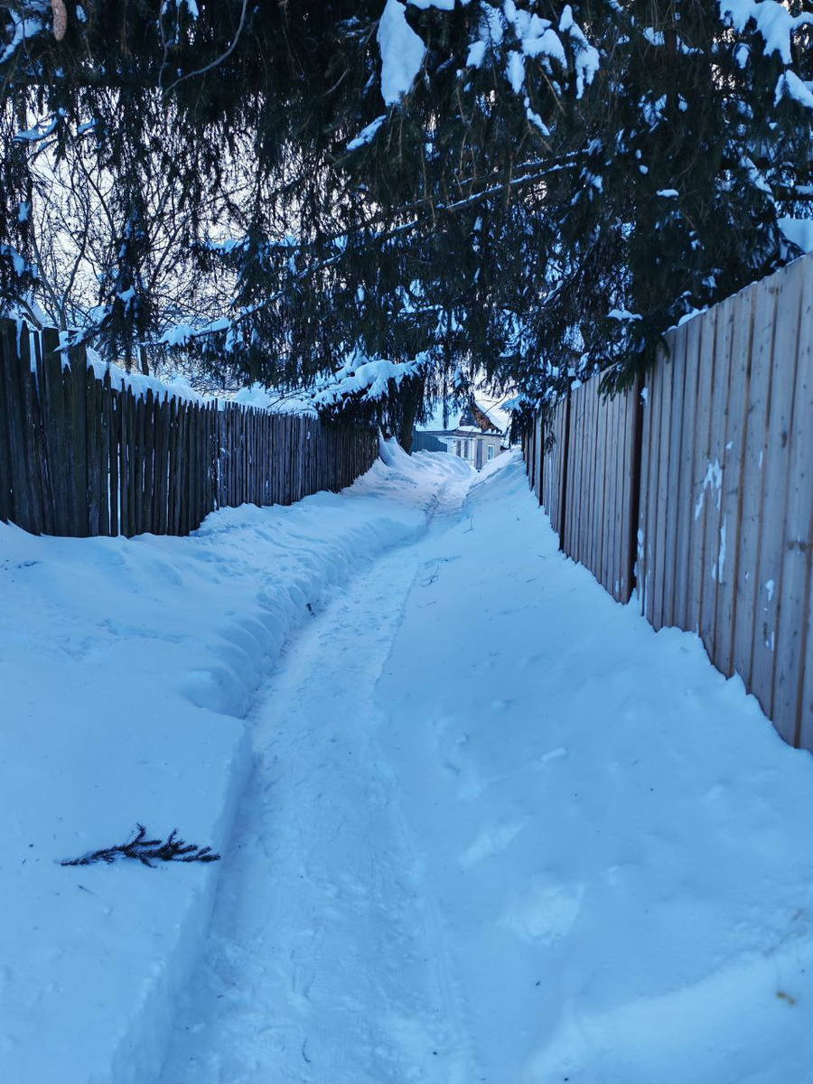 Здравствуйте, дорогие мои друзья! Вот и февраль начался, а новости всё те же. Снег нам дал передышку вчера на полдня, мы с Колей полезли на крышу, хотели скинуть хоть часть снега. Но затея оказалась так себе, мгновенно замёрзли. На улице -17° было, да ещё ветер сильный. Бросаешь снег, а он тебе обратно в лицо летит. Но почти час работали, полчаса на крыше, а потом от дома убирали, что нападало. Вчерашнее утреннее фото. Даже робко солнышко проглядывало. В общем, как снег убрали от дома, как снова снег пошёл. Это утренняя фотография, снега за ночь намело. А это сугробы у мамы в огороде. Больше метра точно. Мне в огороде снег уже скоро кидать будет некуда. В общем, догоним и перегоним Америку по хлебу и салу Камчатку по высоте сугробов. Куча снега на выезде от нашего дома. Другая такая же с другой стороны. Теперь выезжаем осторожно, подкрадываемся к краю и смотрим, нет ли машин. Детскую площадку уже и не чистят, теперь, похоже, до весны. Школа наша местная. Дорожку расчистили. Дн