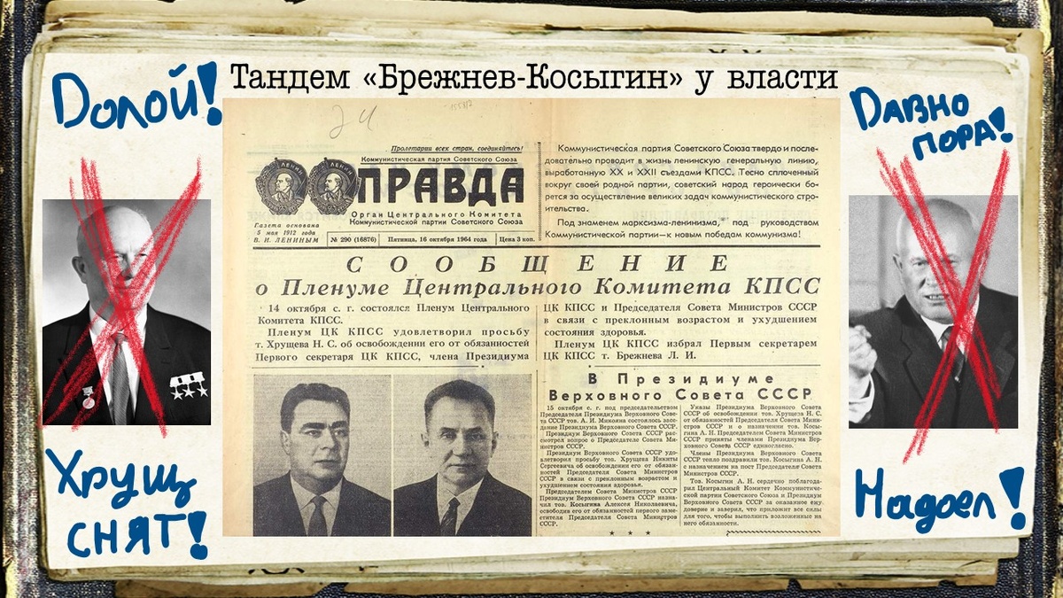 14 октября 1964 г. «Пленум Центрального Комитета КПСС удовлетворил просьбу Н.С. Хрущева об освобождении его от обязанностей Первого секретаря ЦК КПСС, члена Президиума ЦК КПСС и Председателя Совета Министров в связи с преклонным возрастом и ухудшением состояния здоровья» - именно в таком виде о "свержении Хрущёва" узнали советские граждане 16 октября 1964 г. из свежего выпуска газеты «Правда».