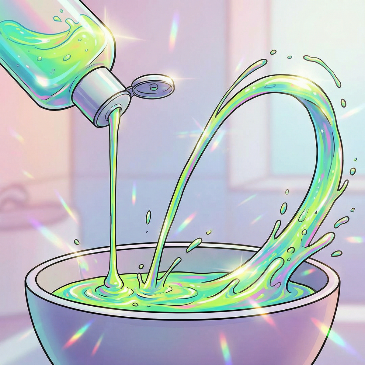Возьмите бутылку густого шампуня или жидкого мыла. Налейте немного в миску. А теперь начните лить тонкую струю сверху — примерно с высоты