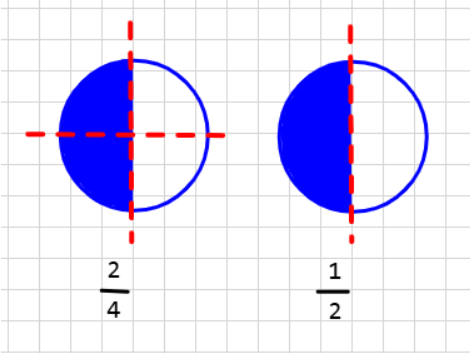 - Если наглядно, то так: берем два равных круга, делим один на четыре равных части, другой – на две. Затем закрашиваем у одного круга две части, у другого – одну и сравниваем рисунки.