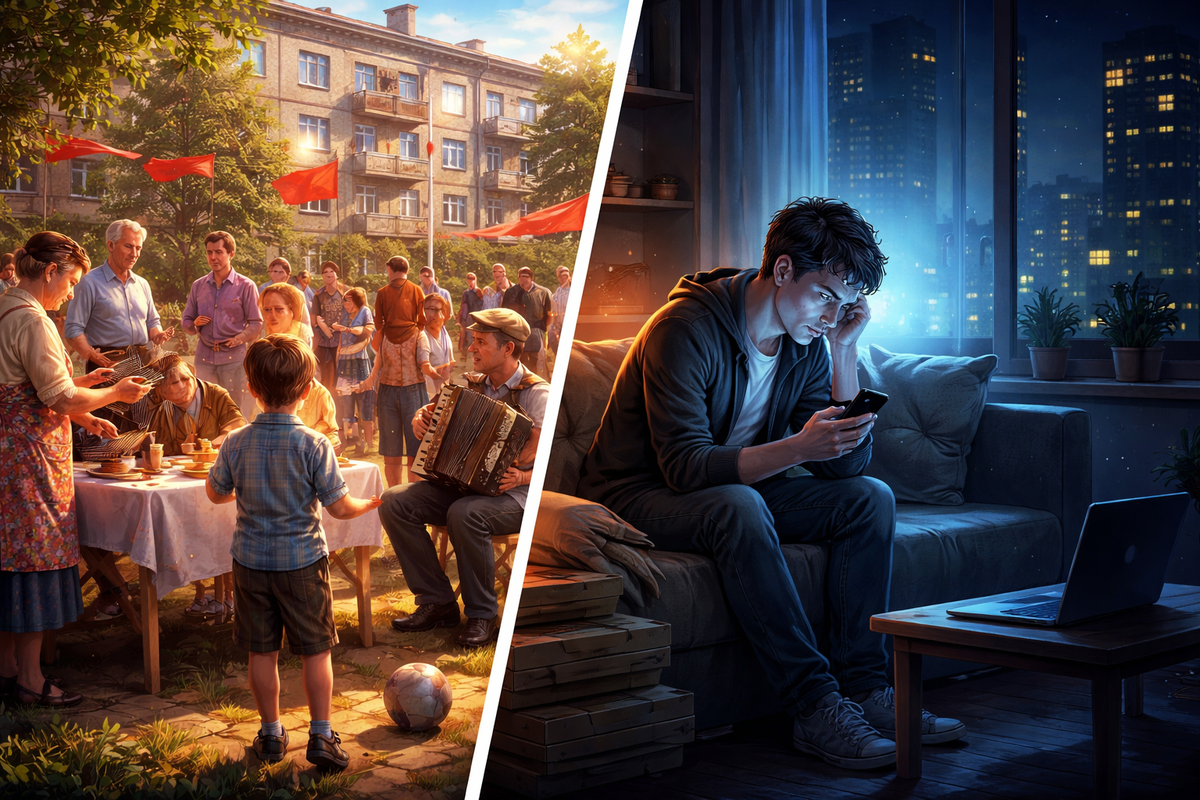 В СССР человек мог жить один, редко звать гостей, не иметь близких друзей и при этом не ощущать той пустоты, которую сегодня называют одиночеством, хотя вокруг были соседи, коллеги и постоянное движение жизни. Сейчас ситуация выглядит противоположно: сотни контактов в телефоне, мессенджеры, социальные сети, возможность говорить с кем угодно в любой момент, но чувство изоляции становится почти фоновым состоянием. Социология давно объяснила этот парадокс, и дело здесь не в романтизации прошлого, а в том, как именно была устроена социальная реальность. Одиночество часто путают с физической изоляцией, хотя в научном смысле это ощущение разрыва социальных связей, когда человек не чувствует себя включённым и нужным. В советской реальности человек мог проводить вечера в одиночестве, но при этом оставаться частью плотной системы отношений, которая ежедневно напоминала о его существовании. Рабочее место, дом, двор и даже магазин создавали ощущение, что ты находишься внутри общего процесса, где