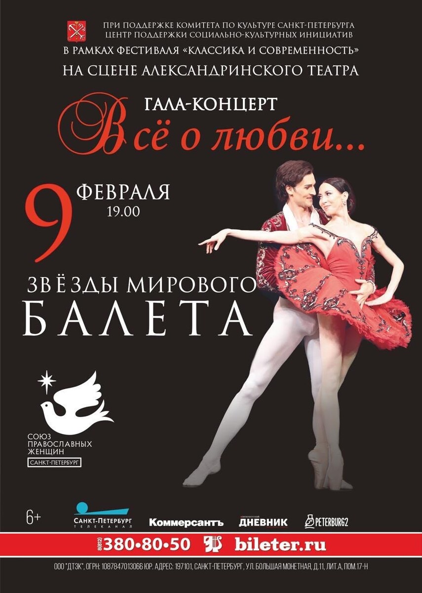 9 февраля в 19-00 на сцене старейшего театра России Александринского театра состоится Гала-концерт звезд мирового балета в рамках фестиваля «Классика и современность». Организатор Гала-концерта – некоммерческая организация «Центр поддержки социально-культурных инициатив», при поддержке Союза православных женщин Санкт-Петербурга. В праздничной программе «Все о любви…» — любимые артисты, неожиданные дуэты и лучшие фрагменты из легендарных балетов о любви. В программе участвуют: народный артист России премьер Мариинского театра до 2007 года, обладатель премии «Золотая маска», «Золотой софит», художественный руководитель Михайловского театра с 2007 до 2009 года, художественный руководитель Новосибирского театра оперы и балета «НОВАТ» Фарух Рузиматов,
