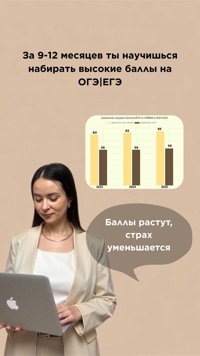 Занятия по моей методике — это система подготовки к экзаменам с твоего уровня до максимума за год. Средний балл моих учеников в 2025 году— 85, когда по России 58 баллов. Если тебе когда-то говорили, что ты не сможешь сдать ЕГЭ/ОГЭ по химии, не верь. Я считаю, что каждый школьник при желании может сдать экзамен на высокие баллы. Главное в начале своего пути сделать диагностику, выстроить четкий план подготовки с учетом собственных пробелов. Каждый день практиковаться, анализировать свои ошибки и писать пробники 1-2 раза в месяц. Чтобы записаться на бесплатное пробное занятие жми сюда. Знакомьтесь - это Амир, мой бывший ученик. В10 классе он совершенно случайно решил выбрать химбио направление. Проблема: отсутствие базы по химии. Провели диагностику, составили четкий план. Занимались 1-2 раза в неделю на протяжении 10-11 класса: Если хочешь на диагностику, скорее жми сюда. На диагностике ты получишь 1)проверку уровня от независимого эксперта; 2)эффективный план подготовки к ЕГЭ по