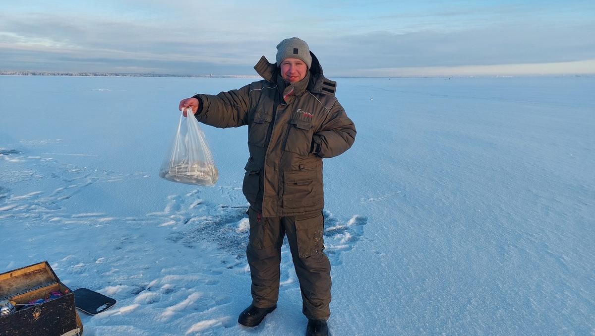 Александр – лидер общего зачёта. Он поймал 67 штук корюшки и трёх окуней. Насадка – свежая корюшка. Антон – 15 корюшин. Проводил эксперименты с карасём, пробовал ловить на ерша и корюшку. Я выловил 30 штук корюшки.
