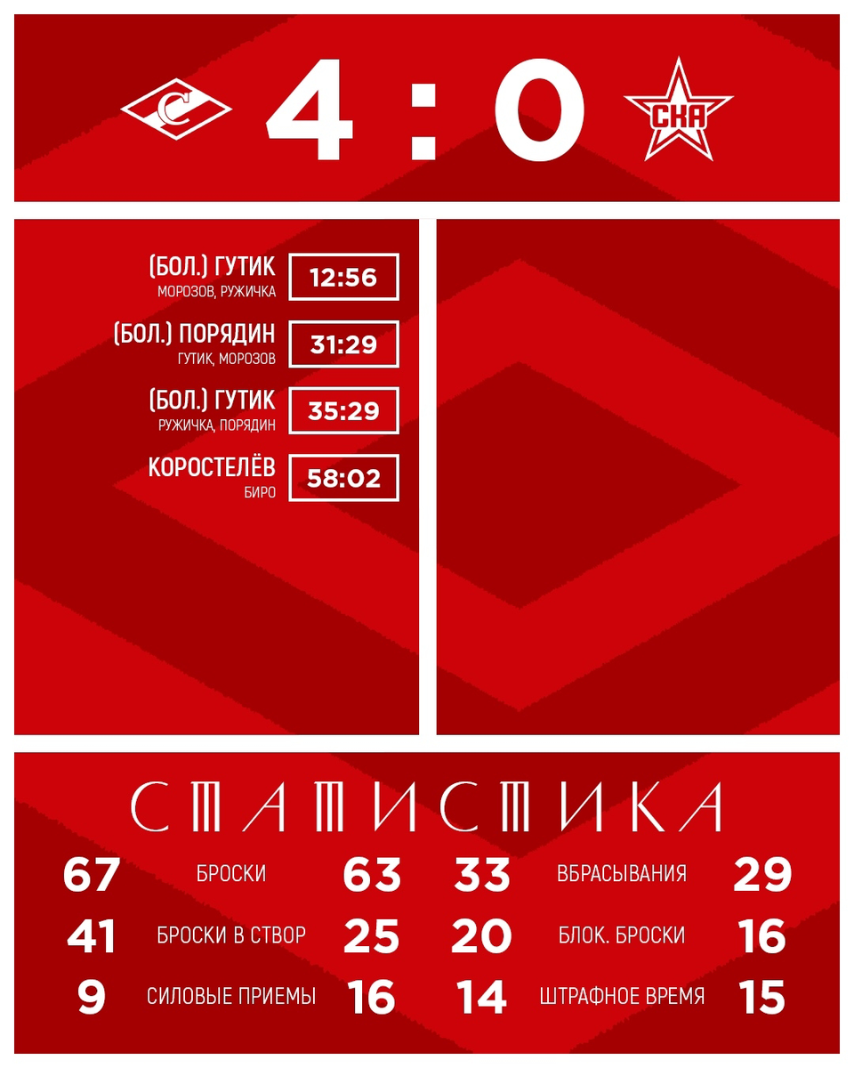 30 января «Спартак» решил напомнить всем, что красно-белые бывают не только по форме, но и по настроению — горячими. Особенно, когда в гости приезжает СКА. Итог вечера — 4:0, и счёт тут вовсе не отражает степень происходящего веселья.