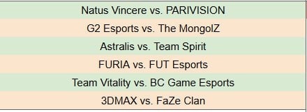 😌 16:00 — NAVI vs PARIVISION 16:00 — G2 vs The Mongolz 18:30 — Astralis vs Spirit 18:30 — FURIA vs FUT 21:00 — Vitality vs BCG 21:00 — 3DMAX vs FaZe Распространите.