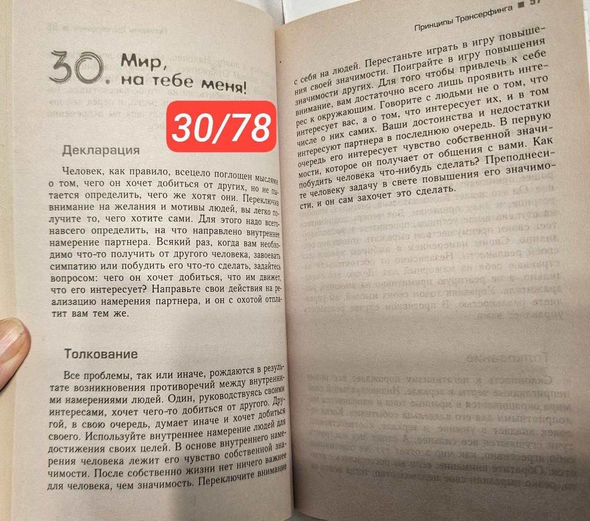 30/78 Практикум управления реальностью - Трансерфинг Мир, на тебе меня! "Человек, как правило, всецело поглощен мыслями о том, чего он хочет добиться от других, но не пытается определить, чего же хотят они. Переключив внимание на желания и мотивы людей, вы легко получите то, чего хотите сами. Для этого надо всего-навсего определить, на что направлено внутреннее намерение партнера. Всякий раз, когда вам необходимо что-то получить от другого человека, завоевать симпатию или побудить его что-то сделать, задайтесь вопросом: чего он хочет добиться, что им движет, что его интересует? Направьте свои действия на реализацию намерения партнера, и он с охотой отплатит вам тем же." "Все проблемы, так или иначе, рождаются в результате возникновения противоречий между внутренними намерениями людей. Один, руководствуясь своими интересами, хочет чего-то добиться от другого. Другой, в свою очередь, думает иначе и хочет добиться своего. Используйте внутреннее намерение людей, для достижения своих це