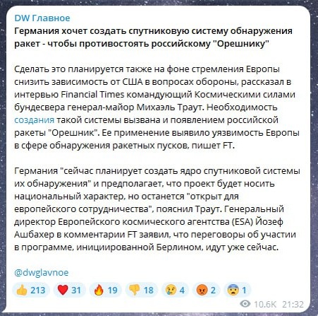 Скажу вам как родным: сто лет назад вы были униженными, голодными, злыми, даже наглыми. Но не такими тупенькими. Ну что вам с того, что вы о пуске этого самого Орешника узнаете? Вам эти 2 минуты чем помогут? Покурить успеете сбегать? Отрадно, конечно, что вы проблему поэтапно решать изволили. Но скажите, чем вы планируете перехватывать цель, летящую падающую со скоростью 7-8 Махов (для либералов, 8-9 тысяч километров в час)? При том, что для ракет-перехватчиков обычно принимается скорость 1.5-2 от скорости цели. А в данном случае ещё будет учитываться время реакции (время от фиксации и классификации цели до принятия решения на перехват и запуска противоракеты), которое в данном случае кратно больше и совсем уже не линейное. Боши, ахтунг! Это не водопроводные трубы, летящие со стороны Газы. Это то, что падает с неба в режиме "Пыщь! Пыщь! Пыщь!". Вам от того, что ваши системы этот самый "Пыщь!" зафиксируют, легче станет? Вот и фюрер ваш подсказывает: "Nein, das ist eine schlechte Idee!