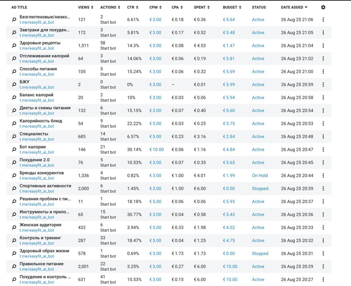 Наш лучший источник трафика В прошлом посте я рассказал, как мы выбирали тарифы. Теперь настал черед маркетинга. Есть один источник трафика, который стабильно показывает крутые результаты. Прошлой весной в Telegram Ads появился формат поисковой рекламы: объявления показываются над результатами глобального поиска по выбранным ключевым словам. Как видно на скрине, цифры вполне достойные. Что неудивительно, ведь это максимально целевой трафик – пользователь уже находится в телеге и прямо там хочет найти что-то на нашу тему. Но, как говорится, есть один нюанс. Поиском пользуется не очень много людей. Так что большой бюджет тут не открутишь. К тому же в поисковом формате нельзя использовать UTM: допускаются только ссылки на каналы и боты без параметра start, из‑за чего считать точную окупаемость сложно. Короче говоря, поисковая реклама в Telegram ads как основной источник трафика в нашем случае не подошла, поэтому мы продолжили тестировать другие гипотезы. А вот какие — расскажу в сле