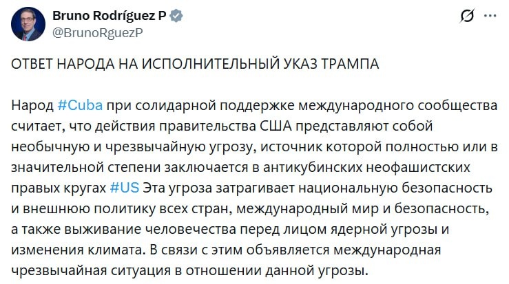 ⚡️Министр иностранных дел Кубы Бруно Родригес сообщил о том, что страна объявила международную чрезвычайную ситуацию в ответ на действия