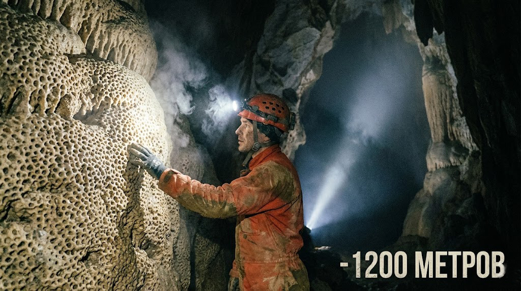 Мы спускались двое суток. Прошли «шкуродеры» (узкие лазы, где ползешь на выдохе), вертикальные колодцы, подземную реку. Глубина — 800 метров. Связь с поверхностью только через подземный телефонный кабель, который мы тянули за собой.