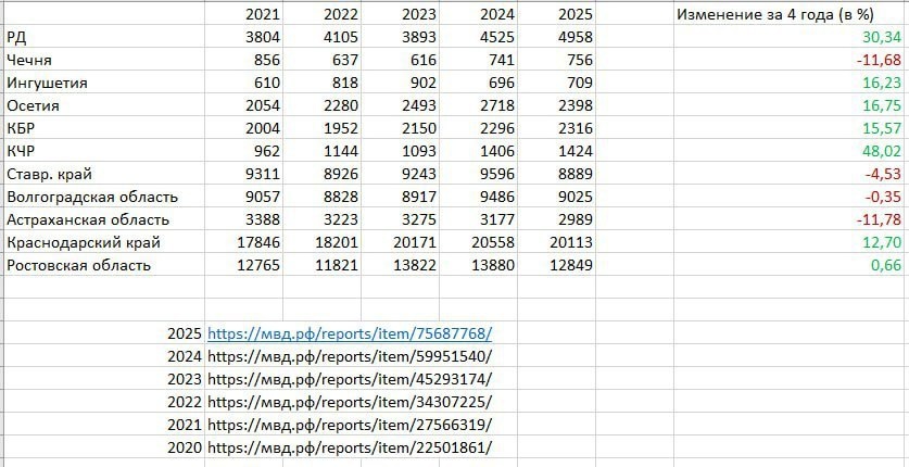 После вчерашней новости про трагедию в Дербенте, стали ожидаемо появляться комментарий, мол "куда мы катимся", "раньше такого не было"... И я решил проверить, действительно ли количество убийств в Дагестане увеличилось в 2-5 раз (или 10), как пишут некоторые. Выводы получились интересные. Согласно официальной статистике МВД России, с 2021 года по 2025 тяжких преступлений в Республике Дагестан стало больше почти на 30% (c 3804 до 4958). При этом в количественном значении это почти в 2 раза меньше, чем в Ставропольском крае и Волгоградской области, в 4 раза меньше, чем в Краснодарском крае, в 2,5 раза меньше чем в Ростовской области. (Учитывая ещё, что в республиках СКФО туда попадают и "террористические преступления", в том числе и комментарии и денежные переводы, которые обыватель зачастую не замечает). Прирост из соседних республик больше всего был Карачаево-Черкессии, почти на 50% (с 962 по 1424). В остальных республиках Кавказа прирост за 4 года незначительный, чуть больше 15%.