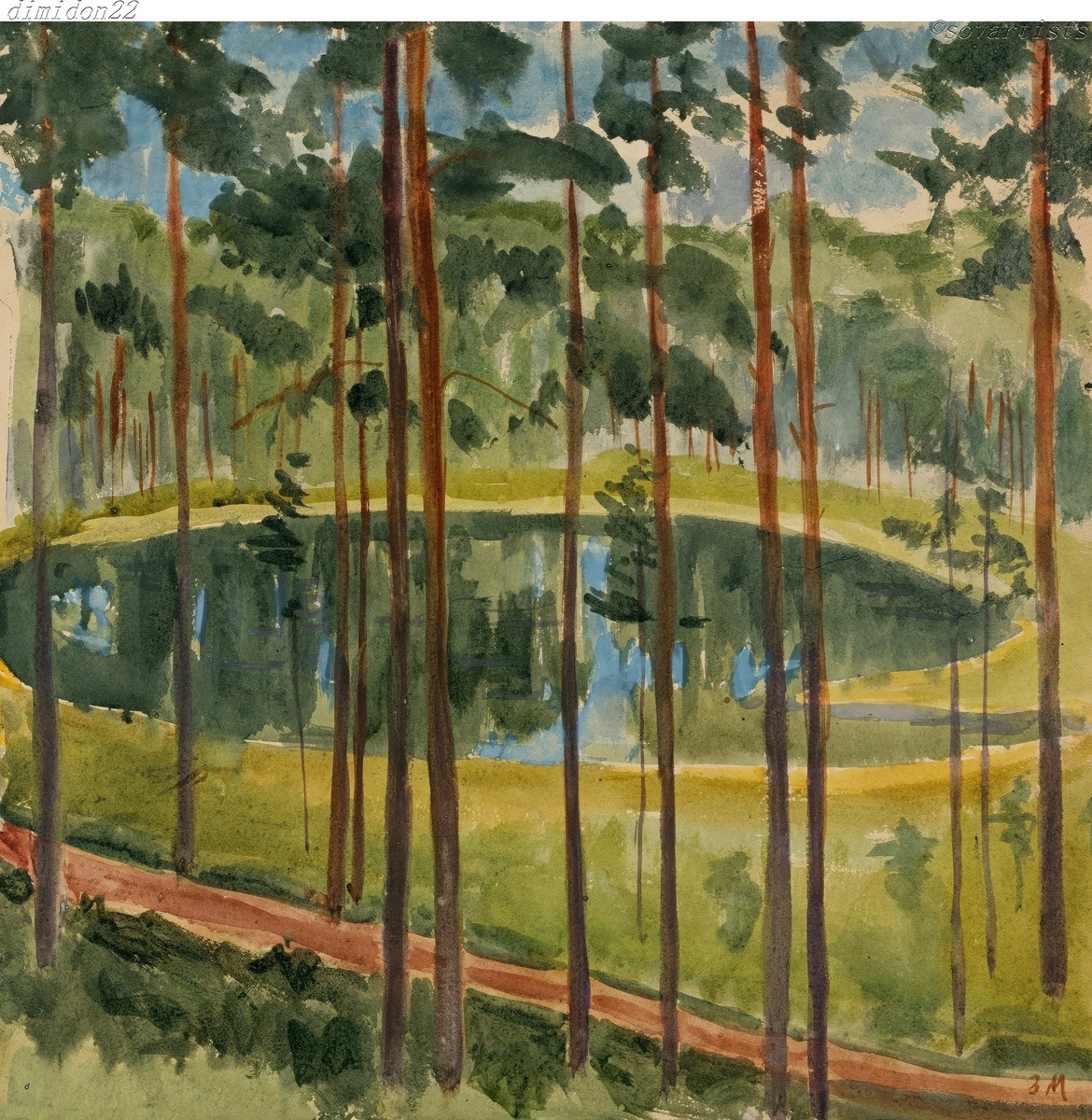 Матвеева - Мостова Зоя Яковлевна (29.01.(10.02).1884, Пермь - 04.01.1972, Москва). «Лесное озеро. Луга». 1937 год. Бумага, акварель, белила; 327 x 324 мм.; (Государственная Третьяковская галерея).