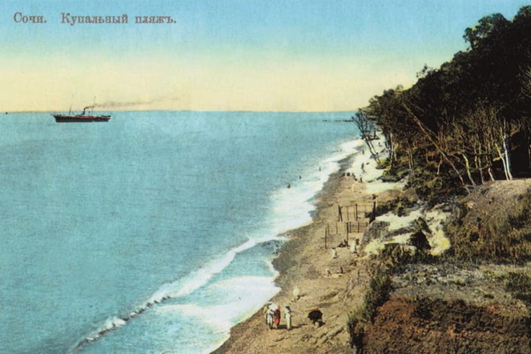Вот как описывает пляжи в своей книге «Старый Сочи конца XIX – начала ХХ века» К.А. Гордон: «Деревья спускались к самому пляжу, и до полудня на него падала их широкая и прохладная тень. Сами пляжи были тогда другими – такими, какими их создала природа: широкие, песчаные ближе к кромке земли и мелкогалечные ближе к морю. Абсолютно чистые, с массой разноцветных камешков и мелких ракушек».