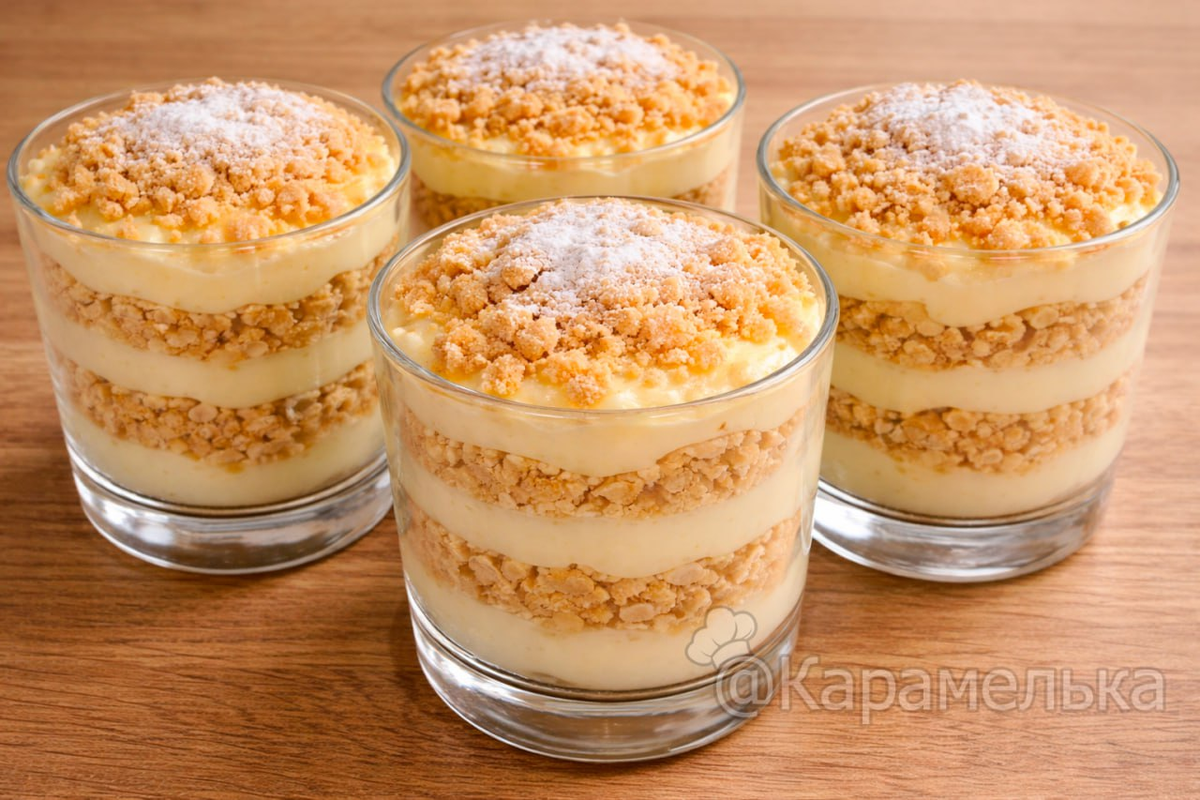 Здравствуйте, мои хорошие! Бывают такие дни, когда вроде бы и тянет на что-то сладкое, домашнее, с кремом и крошкой, но мысль о раскатывании коржей и возне с духовкой вызывает лёгкую усталость. Вот именно для таких вечеров у меня есть один спасительный рецепт. Он про уют, про удовольствие и про тот самый вкус «Наполеона», только без лишних хлопот. Готовится просто, выглядит мило, а исчезает со стола быстрее, чем вы успеете заварить чай. Этот десерт я особенно люблю делать в будни. Пока на плите варится крем, кухня наполняется тем самым тёплым молочным ароматом, а крошка на сковороде тихонько шуршит, подрумяниваясь. Всё просто, понятно и без суеты. А результат такой, что хочется поставить стаканчик перед собой, сесть поудобнее и никуда не спешить. Ингредиенты: Как приготовить: 1. Начинаем с песочной крошки. В удобную миску насыпаем муку, добавляем сахар и щепотку соли. Холодное сливочное масло натираем на крупной тёрке прямо в муку. 2. Быстро перетираем всё руками, не стараясь добиться
