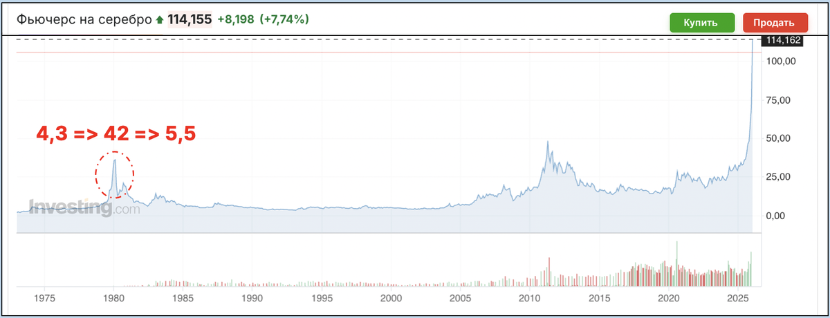 Позавчера выступал перед клиентами БКС в Волгограде. Спасибо большое коллегам за отличную организацию и клиентам компании за интерес к теме акций и точные вопросы. В презентации я высказал свое мнение о росте цен на металлы, тезис следующий — текущее движение спекулятивное и участвовать в нем опасно (причем в обе стороны), приводил вот этот график серебра с пиком 1 980 года, когда цены сходили с 4$ на 42$ и вернулись затем на 5$. Считаю, что покупать циклические товары после такого роста не следует, есть высокая вероятность потери денег. Следующий рабочий день провел в офисе БКС в Волгограде. Встречались с клиентами, общались с менеджерами. И вот менеджерам было несколько звонков от клиентов за день (золото росло до 5 600 $, серебро до 120 $, звонки были — «стоит ли покупать, оно выросло еще на 4% в день, а мы еще не взяли» и т.д., и мы с менеджерами как раз обсуждали, что нет, не надо, конечно, опасно). Прям типичное FOMO. И из офиса брокерской компании это было особенно заметно. Сего