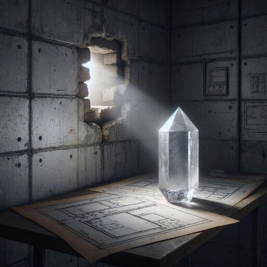 Бетон был крепким, но перфоратор справлялся. Пыль, грохот. Он проделал отверстие диаметром сантиметров пять и глубиной около десяти. И наткнулся на пустоту. Осторожно расширил отверстие. Внутри стены, в специальной нише, лежал предмет. Не капсула. Не документы. Это был… кристалл. Примерно с кулак размером, неправильной формы, мутно-серый, похожий на кварц, но с внутренними прожилками, которые слабо светились тусклым, едва уловимым жёлтым светом, похожим на свет умирающей лампочки. Кристалл был вмонтирован в небольшую медную оправу с контактами, от которых шли тонкие провода, уходящие куда-то вглубь бетона.