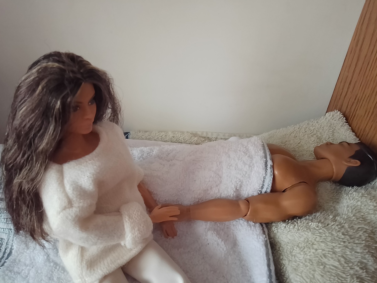- Я держу тебя пострадавшей рукой... Так что сиди пожалуйста где сидишь). И верни, будь так любезна, свои руки туда, где они были в тот момент, когда нас прервали.