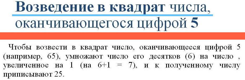 Сегодня для вас мы подготовили небольшую статью о том как быстро в уме возводить числа в квадрат которые оканчиваются на цифру 5. Это может пригодится в повседневной жизни, если потренироваться, то вы сможете это делать очень быстро и без калькулятора.