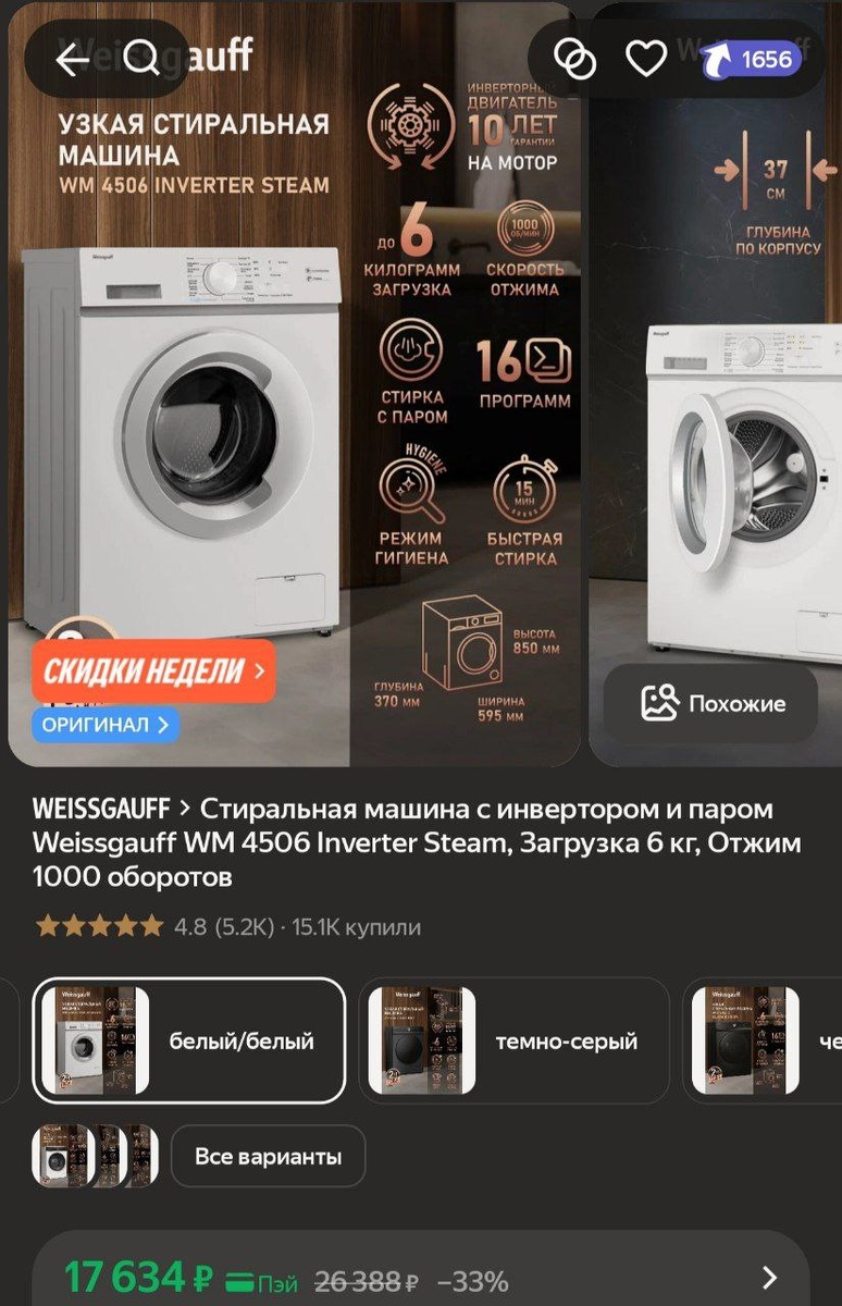 Стиральная машина с инвертором и паром Weissgauff WM 4506 Inverter Steam, Загрузка 6 кг, Отжим 1000 оборотов