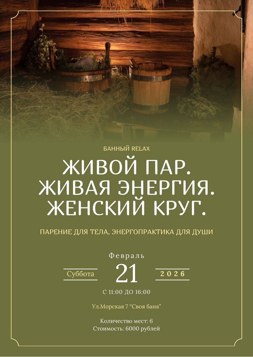 ЖИВАЯ ЭНЕРГИЯ. 21 ФЕВРАЛЯ. Закрытый женский круг в бане в сопровождение пар-мастера Татьяны Гусаковой и психолога-энерготерапевта Екатерины Солондаевой. 🧖♀️Дорогие женщины! Что если последний месяц зимы станет не временем усталости, а точкой мощной перезагрузки перед весной? Мы приглашаем вас на уникальное 5-часовое погружение, где мы соединим древнюю силу банного ритуала и современные практики работы с энергией. Это день, созданный для того, чтобы растопить зимнее оцепенение, сбросить груз накопленной усталости и разжечь ваш внутренний огонь. Этот день для вас, если: 🌸Вы чувствуете, что зима «высушила» ваши силы, и нужна глубокая подзарядка. 🌸Вам не хватает внутреннего тепла, легкости и ясности. 🌸Вы хотите не просто погреться в бане, а прожить осознанный ритуал обновления в поддерживающем кругу. 🌸Вы готовы отпустить всё лишнее и встретить весну обновлённой. 🕖21.02 с 11:00 до 16:00 📍Ул.Морская 7 «Своя баня» 💰6000 рублей 🎁 Бонус: каждая участница получит в подарок небол