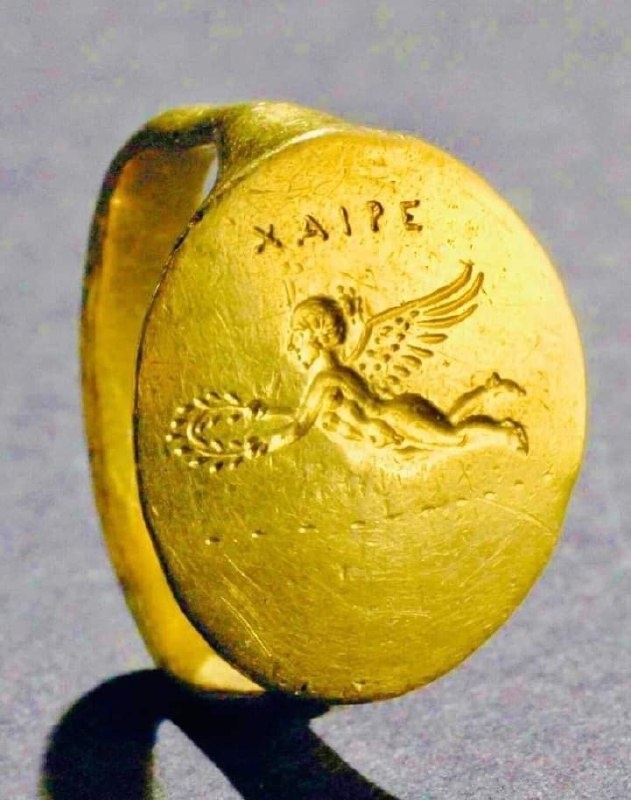 На безеле изображен Эрот (он же Эрос —божество любви в древнегреческой мифологии, безотлучный спутник и помощник Афродиты), он летит влево, держа обеими руками венок. Пунктирная линия земли ниже, а над самим Эротом надпись: Χαῖρε (дословно, «радуйся»). Это стандартное приветствие у древних греков, аналогичное нашему «здравствуйте». Однако кольцо маленькое — внутренний диаметр всего 14 мм, то есть оно принадлежало ребенку или совсем уж миниатюрной женщине. Скорее всего, это подарок девочке с пожеланием от кого-то из родственников. Найдено кольцо на Кефалонии (Ионические острова), Греция. Терра инкогнита | Неизвестная земля