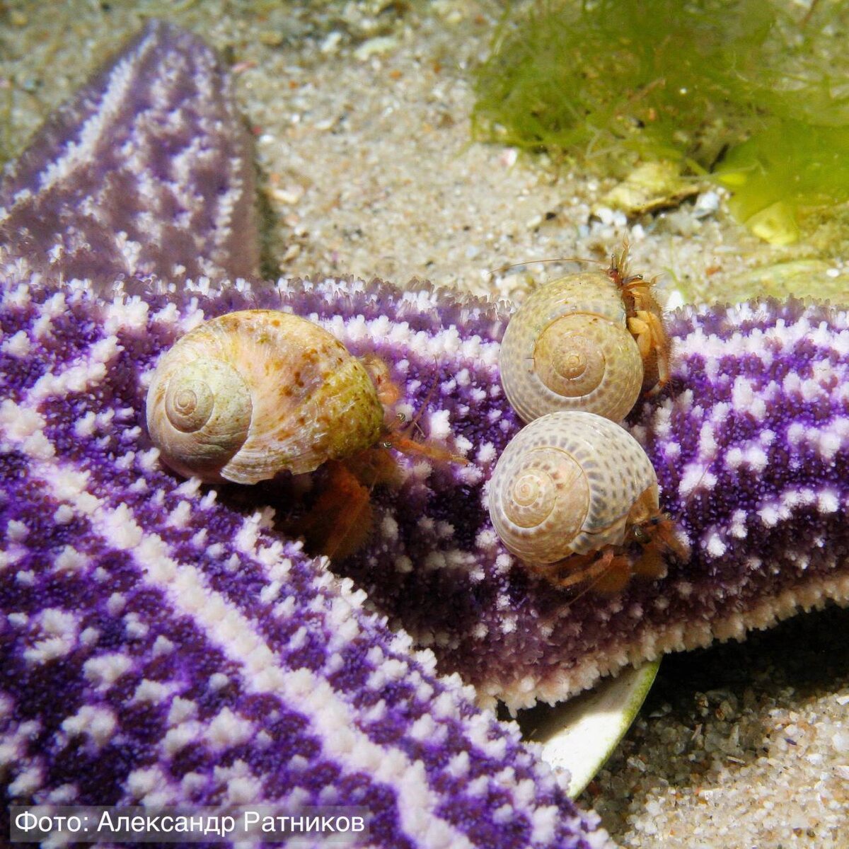 Эти три волосатых рака-отшельника вместе забрались на амурскую морскую звезду. Они слишком малы, чтобы съесть её, но, возможно, морская звезда в это время сама питается. И команда в ракушках ждёт, чтобы отобедать остатками «звёздного» пиршества. Даже отшельники способны объединяться, когда у них есть общая цель. Волосатый рак-отшельник — один из четырёх видов раков-отшельников, обитающих в Дальневосточном морском заповеднике (под управлением «Земли леопарда»). 🐆 Здесь «Земля леопарда»