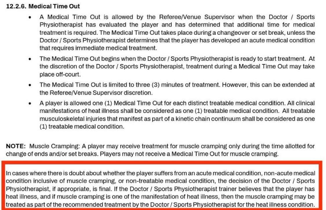 🎾 Если игроку стало плохо из-за жары (рвота, судороги), то он может получить медицинскую помощь и таблетки. Судороги в этом случае также лечатся, и это не противоречит правилам. 📌 Выдержка из правил тенниса: Игроку разрешен один (1) тайм-аут для оказания медицинской помощи при каждом отдельном поддающемся лечению заболевании. Все клинические проявления теплового удара рассматриваются как одно (1) поддающееся лечению заболевание. Подпишись на Эйс и точка